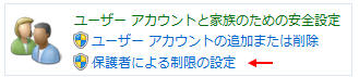 (または「コントロールパネル」−「ユーザーアカウント」ー「別のアカウントの管理」−「保護者による制限の設定」)