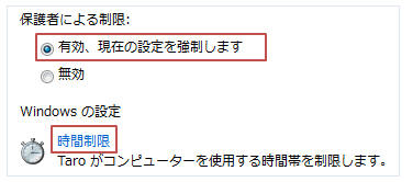 保護者による制限で「有効、現在の設定を強制します」をONにし「時間制限」をクリック