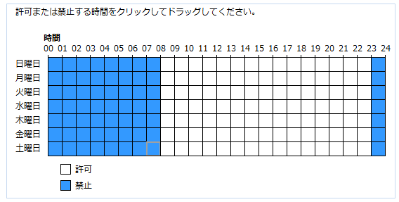 利用を禁止する時間帯のマス目をドラッグする(禁止時間は青く塗りつぶされます)