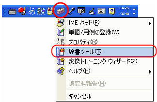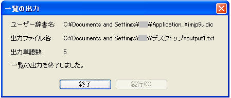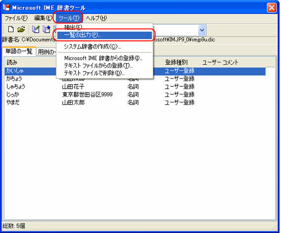 「辞書ツール」ダイアログで「ツール」−「一覧の出力」をクリック