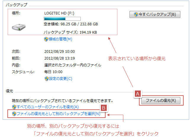 Windowsバックアップによって保存されたデータは「以前のバージョン」としても利用されています。削除/上書きしたファイルを復活させる場合は、この方法が1番簡単でしょう。操作方法は「削除(上書き)したファイルを復活させる(以前のバージョンの復元)」を参照してください。