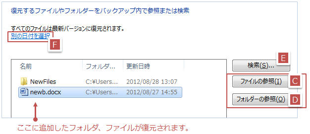 ます。特定のフォルダを復元する場合は「フォルダーの参照」(D)をクリックします。データを選択後「ファイルの追加」又は「フォルダーの追加」をクリックします。