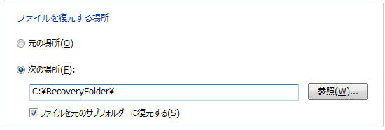 復元場所を指定します。「元の場所」または「次の場所」で任意の場所を指定します。