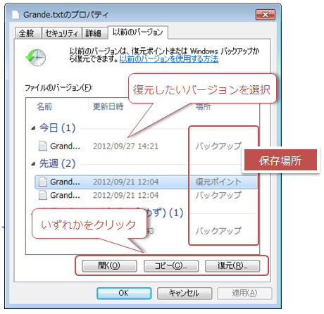 されます。(バックアップで保存されたファイルは現在と同じ版でも「以前のバージョン」タブに表示されます。