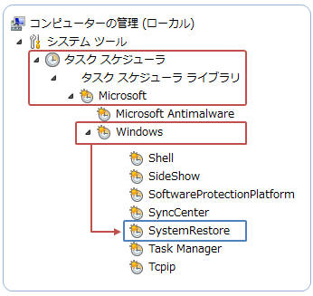 「タスクスケジューラ」−「タスクスケジューラライブラリ」−「Microsoft」−「Windows」−「SystemRestore」をクリック