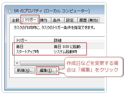 「トリガー」タブをクリック ↓初期設定では「毎日夜12時」「PC起動時」に実行されます。復元ポイント 作成日時を変更する場合は「編集」をクリック
