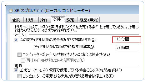 「条件」タブでは実行に必要なアイドルタイム(既定では10分のアイドルタイムがないと実行されない)等を変更できます。 ※10分間のアイドルタイムによりスリープや休止状態になるコンピュータでは復元ポイントが作成できないことがあるので変更するとよいでしょう。
