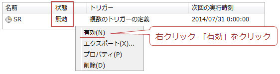 重要2:タスクが「無効」となっていると実行されません。その場合はSRタスクを右クリックし「有効」をクリックしてください。