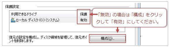 ----------- 補足 ---------------------- 復元ポイントのタスクは、システムの復元が無効では実行されません。「コンピュータ」を右クリック−「プロパティ」をクリックし「システムの保護」をクリックし、「無効」の場合は「構成」をクリックして有効にしてください。(詳細はこちら)