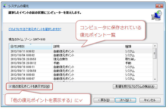 「他の復元ポイントを表示する」にチェックを入れる。一覧を確認したら「キャンセル」で閉じる