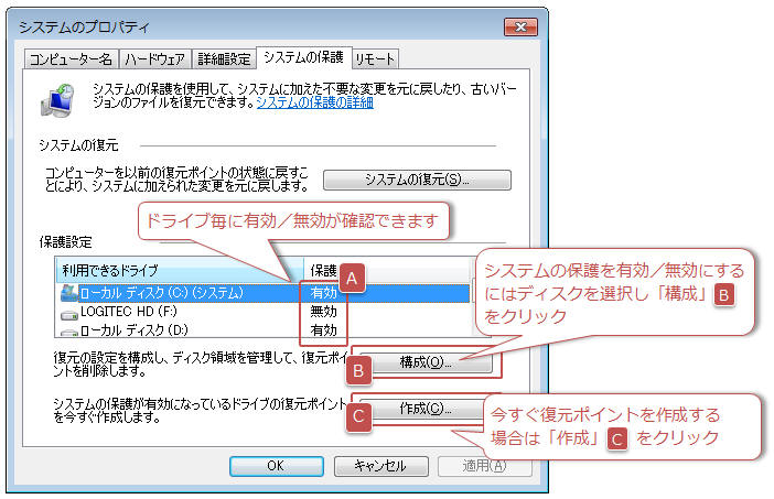 ここで「システムの保護」に関する設定が可能 (A) 現在どのドライブで「システムの保護」が有効か無効かを確認できます (B) 「構成」をクリックすると「システムの保護」を有効/無効にできます。 (C) 今すぐ復元ポイントを作成する場合は「作成」をクリックします。