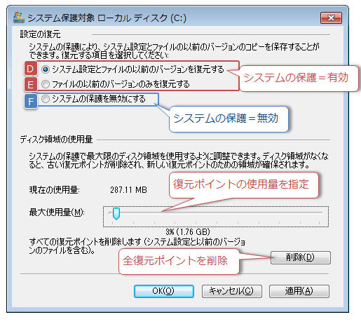 スタートメニューから「コンピューター」を右クリックし「プロパティ」をクリック ※又は「コントロールパネル」−「システムとセキュリティ」−「システム」をクリック 左ウィンドウで「システムの保護」をクリック ここで「システムの保護」に関する設定が可能 (A) 現在どのドライブで「システムの保護」が有効か無効かを確認できます (B) 「構成」をクリックすると「システムの保護」を有効/無効にできます。 (C) 今すぐ復元ポイントを作成する場合は「作成」をクリックします。 「構成」(B) をクリックすると「システムの保護」や「以前のバージョン」に関する設定が可能 (D) 【ファイルの以前のバージョン】および【システムの復元で利用するシステム情報】を保存します (E) 【ファイルの以前のバージョン】のみを保存します (F) システムの保護を無効にするため【ファイルの以前のバージョン】も【システム情報】も保存されません。 ※ 復元ポイント用のディスク領域が少なくなると、古い復元ポイントは自動的に削除されます。※ 復元ポイントが自動作成されるタイミングについては 復元ポイントが作成されるタイミングとはを参照してください。