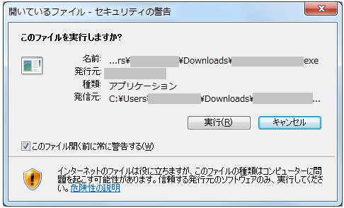 「このファイル開く前に常に警告する」のチェックを外し「実行」をクリック