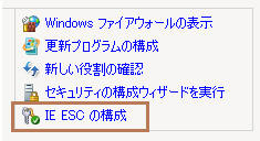 「スタート」−「管理ツール」−「サーバーマネージャー」をクリック 左ペインの「サーバーマネージャー(PC名)」が選択された状態で、右ペインの右側にある「IE ESCの構成」をクリック Internet Explorerセキュリティ強化の構成ダイアログで「オフ」をクリックする (2か所) ※ Administratorsグループ・Usersグループそれぞれで有効/無効の設定が可能です。 (Usersグループの人間が操作する時は有効にしておく、などの運用が可能)
