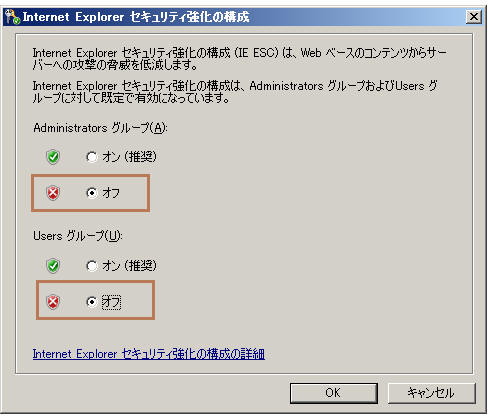 Internet Explorerセキュリティ強化の構成ダイアログで「オフ」をクリックする (2か所)