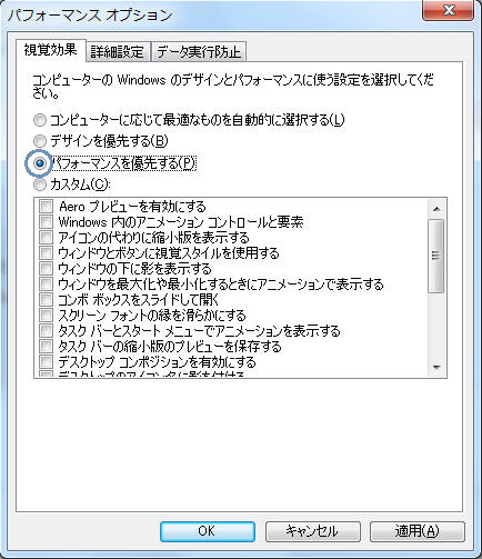 「パフォーマンスオプション」で「パフォーマンスを優先する」をクリック