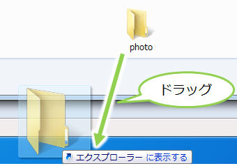 フォルダをタスクバーにドラッグし「エクスプローラーに表示する」が表示されたらマウスを離す