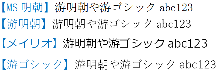 游明朝や游ゴシック等の【游書体】は、Windows8.1以降のWindowsにバンドルインストール(付属インストール)されています。 また、Office2016にも同胞されています。(Word2016からは標準フォントが游明朝。MS明朝ではなくなった)デザインしたのは字游工房という会社です。 …… 游書体の一部を、MS明朝やメイリオと比べてみましょう。…… 確かに綺麗ですね…。游ゴシックは非常に見やすいですし、游明朝も美しい。さすが長年同じだった標準フォントを変更するだけの威力があります。
