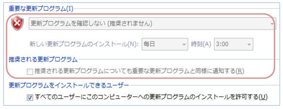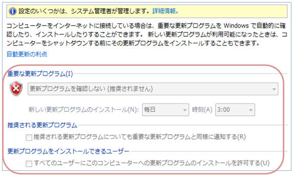 この設定により、Windowsの「重要な更新プログラム」及び「推奨される更新プログラム」の自動更新は無効になります。