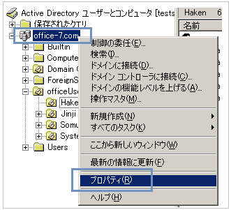 ドメインコントローラにログインし、「スタート」−「管理ツール」−「Active Directoryユーザーとコンピュータ」をクリック