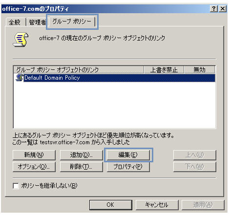 「グループポリシー」タブをクリックし、「Default Domain Policy」を選択して「編集」をクリック