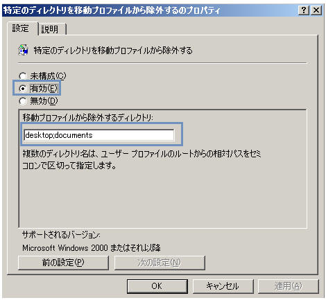 「有効」をONにし、「移動プロファイルから除外するディレクトリ」に除外したいフォルダを指定(フォルダ名だけでOK。例えばデスクトップと、ドキュメントを除外する場合は「Desktop;Documents」と入力)