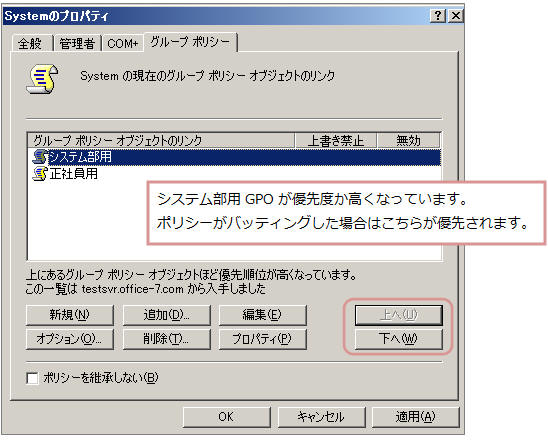 リンクしたGPOは優先度を指定できます。GPOを選択し「上へ」又は「下へ」をクリック