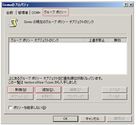 「グループポリシー」タブをクリックし、新しいGPOを作成してリンクするなら「新規」をクリック、既存GPOをリンクさせるなら「追加」をクリック