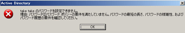 Active Directory ユーザーを作成時「パスワードはパスワードポリシーの要件を満たしていません…」エラー |