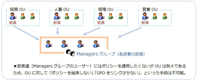 例えば、ユーザーは部署ごとのOUに格納されており、それぞれの部長達(彼らはManagersというグループに所属)にはポリシーを適用したくない…といった場合です。