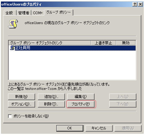 Active Directoryユーザーとコンピュータで、目的のGPOがリンクされているコンテナを右クリックし「プロパティ」−「グループポリシー」タブをクリック