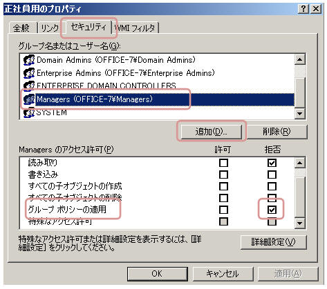 「セキュリティ」タブをクリックし、「追加」をクリックしてアクセスを拒否したい(ポリシーを適用したくない)ユーザーやグループを指定(今回はManagersグループを指定)し「グループポリシーの適用」を拒否にする