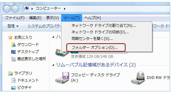 スタートボタンをクリックし、「コンピュータ」をクリック 「ツール」−「フォルダーオプション」をクリック 「表示」タブをクリックし、「登録されている拡張子は表示しない」のチェックを外す 「OK」をクリックして閉じる