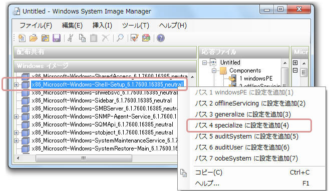Windowsイメージの「Components」を展開し「X86_Microsoft-Windows-Shell-Setup_6.1.760016385_neutral」を右クリック