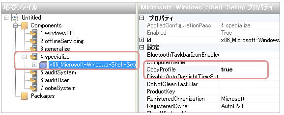 応答ファイルの「4.specialize」に追加された「X86_Microsoft-Windows-Shell-Setup_6.1.760016385_neutral」を選択し「設定」のCopyProfileにtrueと入力