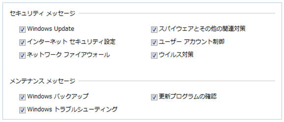 「スタート」−「コントロールパネル」−「システムとセキュリティ」−「アクションセンター」をクリック 左ペインの「アクションセンターの設定を変更」をクリック 下記全てのチェックを外して「OK」をクリック