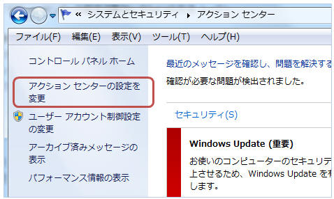 「スタート」−「コントロールパネル」−「システムとセキュリティ」−「アクションセンター」をクリック