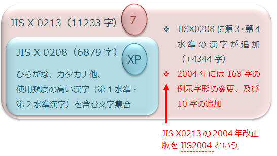 Windows7では、JISX0208に更に第3・第4水準漢字(これらの多くはJISX0212と重複)、記号を追加したJIS