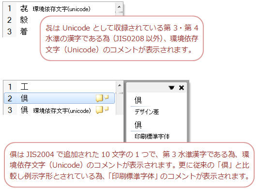 X 0208以外の文字に対しては「環境依存文字」「環境依存文字(Unicode)」のコメントが