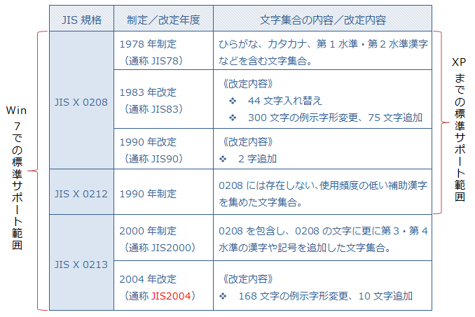 XPではひらがな、カタカナ、第1水準・第2水準の漢字を収録したJIS X 0208という文字集合を標準サポート★注していましたが、7ではこのJIS0208に更に第3水準・第4水準の漢字や記号などを加えたJIS