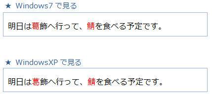 Windows7ではJIS2004を標準サポートしているとはいえ、これらに含まれる第3・第4水準の漢字はUnicodeとして収録されています。つまりUnicodeをサポートしていないシステムやアプリケーションでは表示することはできません。また、JIS2004で例示字形(JISが推奨する字形)が変わった文字はOSによっては異なる表示になってしまいます。