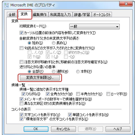 文字化けする可能性のある字はそもそも入力できないようにしたい、という場合は変換候補から除外することができます。
