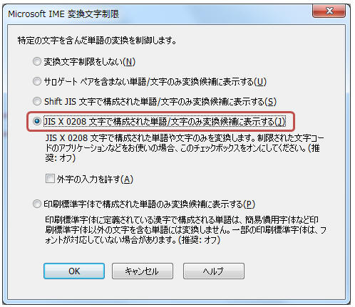 この設定をするとJIS X 0208以外の文字は変換候補に表示されなくなります。