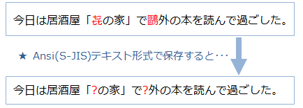 Unicodeとして収録されている文字は、ANSI(S-JIS)形式で保存すると文字化けしてしまいます。