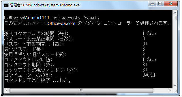 現在クライアントコンピュータに適用されているアカウントポリシーはnetコマンドで確認することができます。