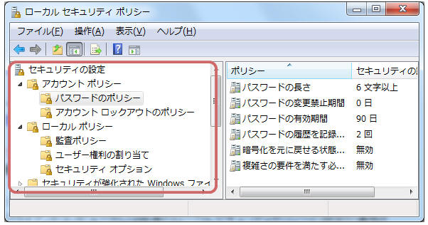 ローカルセキュリティポリシーには予め「アカウントポリシー」や「ユーザー権利の割り当て」「セキュリティオプション」など、PC操作に必要なセキュリティが定義されています。