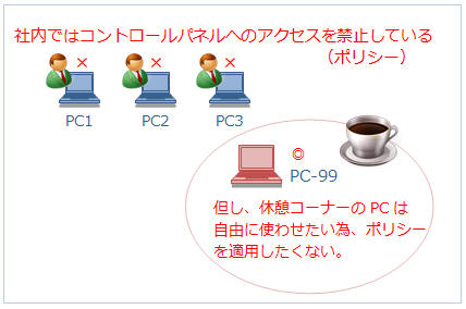 PC-99が属するOUに新しいGPOをリンク作成し、以下のポリシーを定義します。