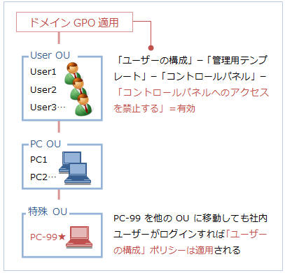 つまり、今回の場合は“特殊OU”の「コンピュータの構成」ポリシー適用後、“User