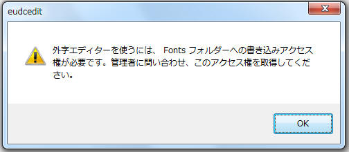 「外字エディターを使うには、Fontsフォルダーへの書き込みアクセス権が必要です。管理者に問い合わせ、このアクセス権を取得してください。」