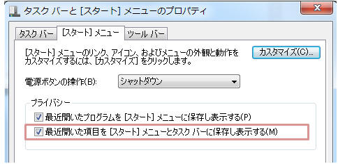 「タスクバーとスタートメニューのプロパティ」が開いたら「スタートメニュー」タブにある「最近開いた項目をスタートメニューとタスクバーに保存し表示する」を確認し、チェックが外れていたらチェックを入れる。